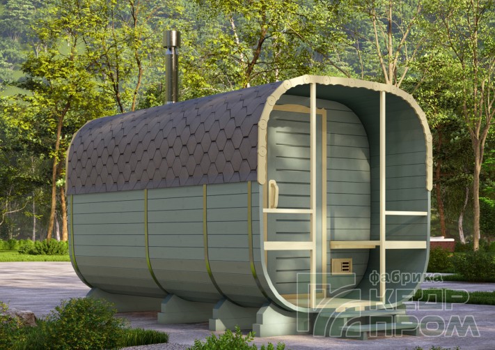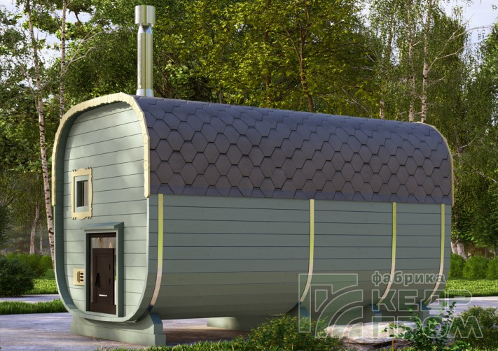Баня бочка 4 метра длиной с верандой, или можно так сказать с крыльцом. По оснащению и комплектации аналогична предыдущим моделям такой же длины, за исключением изменения внутреннего размера комнаты отдыха, она стала чуть меньше, но зато появилось крылечко с двумя сидениями, где можно посидеть на свежем воздухе после жаркой бани.