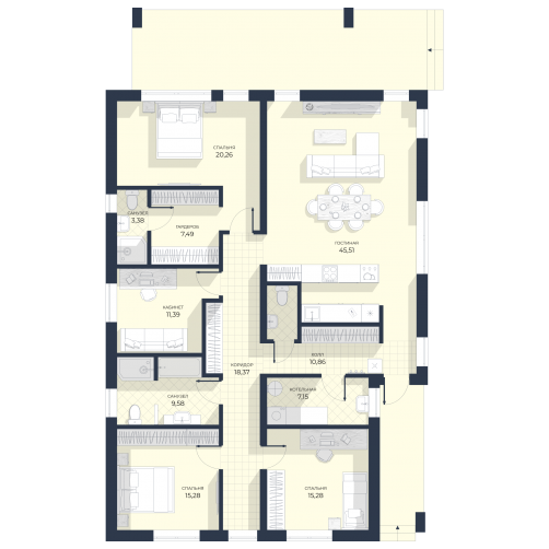 Дом, в котором всё продумано для вашего комфорта. Большой зал, столовая и кухня — именно здесь будут проходить и тихие семейные вечера, и весёлые праздники с гостями! Спальни для личного времени и отдыха!
