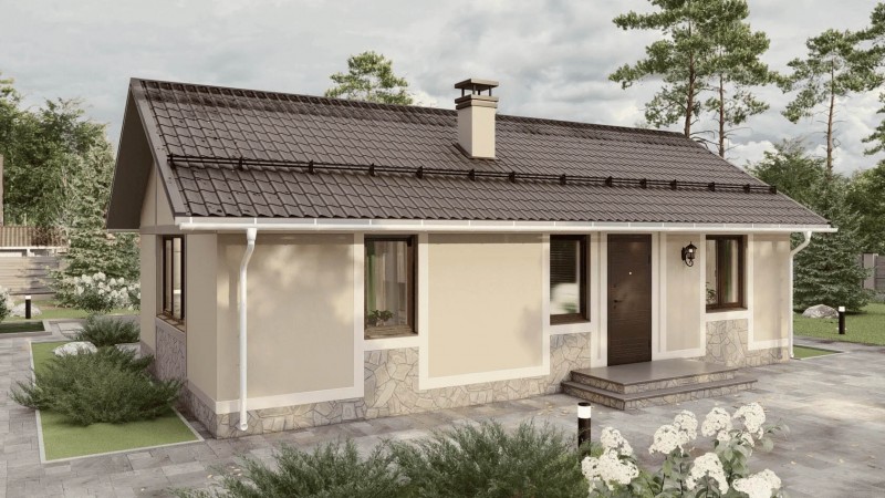 Данный проект отличается рациональным использованием площади. Все помещения изолированы и имеют четкое функциональное назначение. Наличие двух спален делает дом универсальным для семьи с одним ребенком, пары или тех, кому нужна гостевая комната. Большой плюс — отдельная кладовая и объединенная кухня-гостиная, что соответствует трендам современного комфортного жилья.