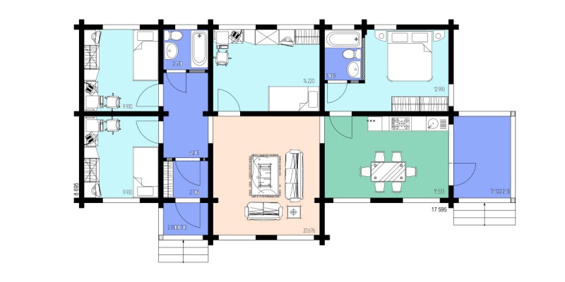 Дом полностью из клееного бруса. Стены обработаны декоративной и защитной пропиткой. Кроме базового домокомплекта, в проект включены электрика, отопление, водоотведение, окна и двери. Вам остается только расставить мебель в вашем новом экодоме.