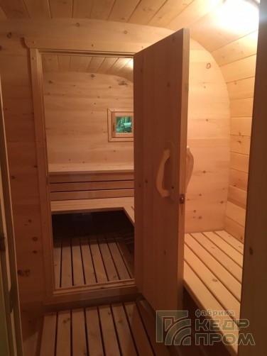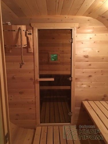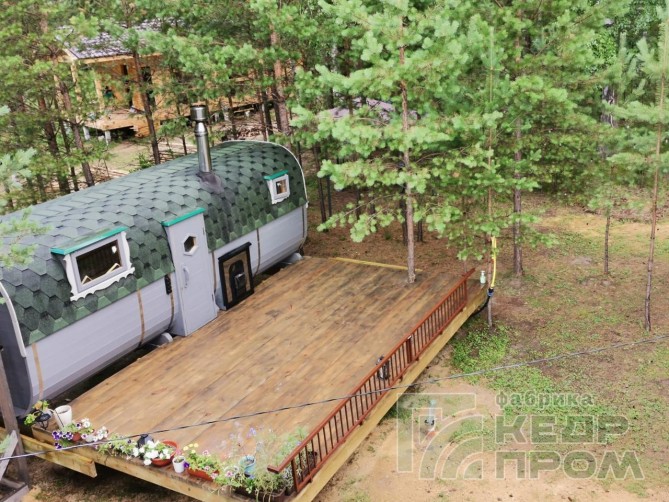 Квадратная 6-ти метровая баня-бочка из древесины кедра с боковым входом – максимум комфорта! Квадратная форма бани-бочки с закруглёнными углами придаёт необычный вид и увеличивает пространство внутри. Боковой вход в тамбур разделяющий парную от комнаты отдыха.