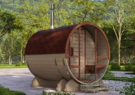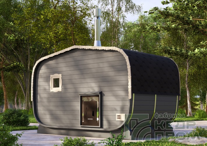 Квадро-овальная банька длиной 4 метра и шириной 2,35 метра. Отличается, в первую очередь, оригинальным внешним видом. Внутреннее оснащение бани - это просторная парная и комната отдыха, в которых имеется всё: печь в комплекте с дымоходом, удобные полки, трапики, стол, сидения, окна, и даже камни для печи, докупать ничего не нужно.