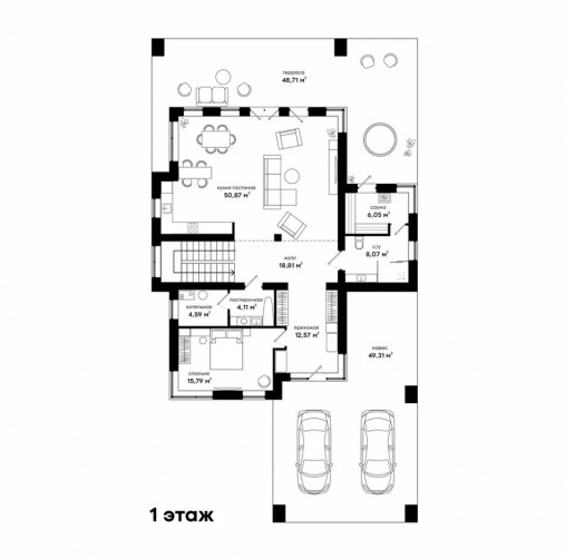 Навес на две машины и полуоткрытая терраса соединяют дом с окружающей средой.
