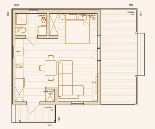 Одноэтажный дом с крыльцом и прилегающей террасой – отличное решение для постоянного проживания 1-2 человек. Особенности проекта – небольшая прихожая и полностью укомплектованный санузел. Ванна или душевая кабина – выбор за вами.