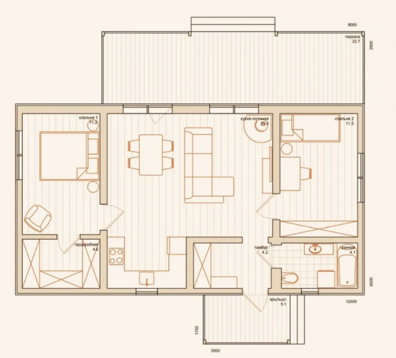 Одноэтажный модульный дом с двумя спальнями и кухней-гостиной – подходящий вариант для семьи из 3-4 человек. Площадь жилых помещений составляет 52 м2.