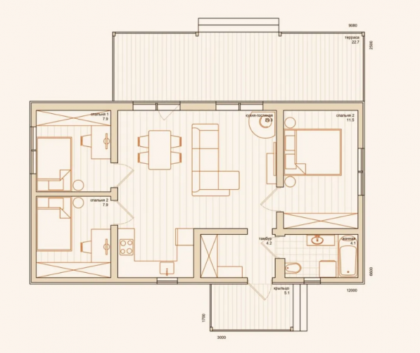Модульный дом в один этаж с жилой площадью в 56,6 м2 – выгодное решение для семьи с детьми. В проект включены три спальни, две из них (по 7,9 м2) можно превратить в детские комнаты.