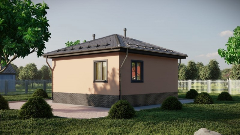 Планировка проекта максимально эффективно использует каждый метр площади. За входной дверью расположен небольшой холл. Сразу возле входа – техническое помещение, затем санузел. Чуть дальше расположены две спальни (площадь каждой около 10 м2) и кухня-гостиная площадью 13,7 м2.