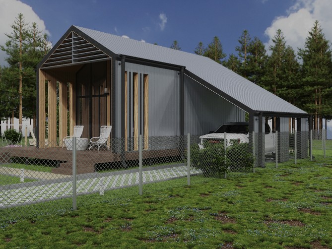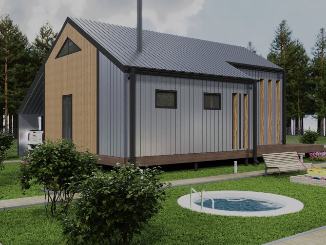 Дом в стиле Барнхаус – брутальность снаружи и уют внутри. 2 этажа с панорамными окнами, 2 комнаты, антресоль, терраса.