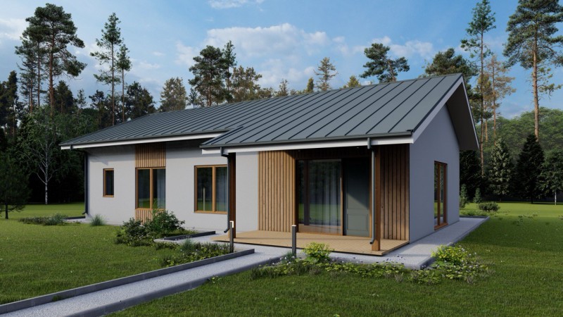 Проект одноэтажного дома в современном стиле с двускатной крышей, с гардеробной, примерочной и большой террасой. Имеется 3 спальни.