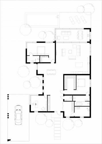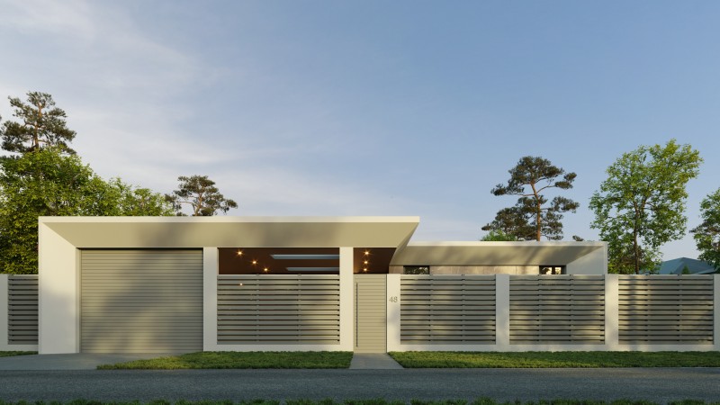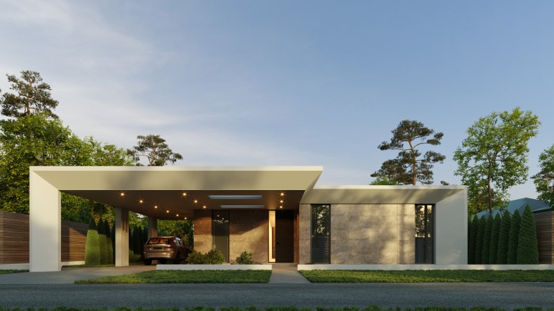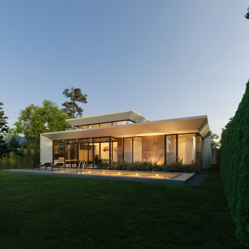 Одноэтажный загородный дом в стиле Райта гармонично вписывается в окружающий ландшафт. Его открытые пространства создают ощущение свободы и легкости. Большая терраса с бассейном и просторная веранда с зоной барбекю обеспечивают идеальные условия для отдыха на свежем воздухе.
