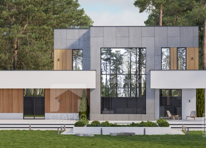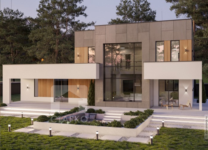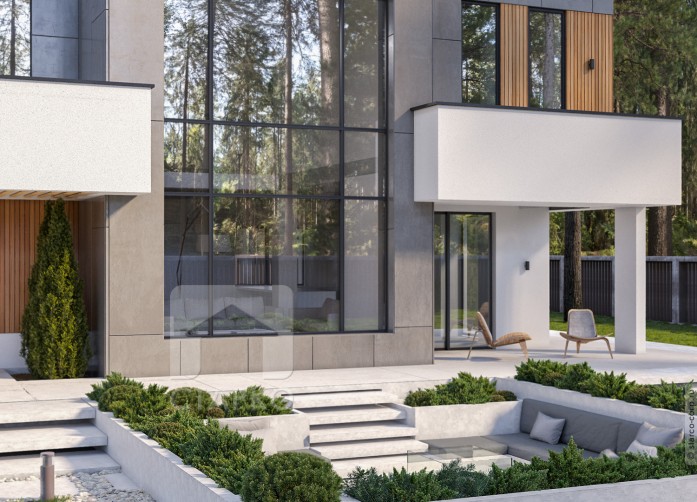Гармоничный, лёгкий, стильный дом. Архитектура в стиле современного минимализма: простые формы, плоская кровля, большая площадь остекления. Коттедж притягивает взгляды, восхищает своей простотой и одновременно уникальностью.