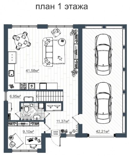 Большой гараж не только вместит два автомобиля, но и даст возможность размещение дополнительных зон для хозяйственных нужд и мастерской.
