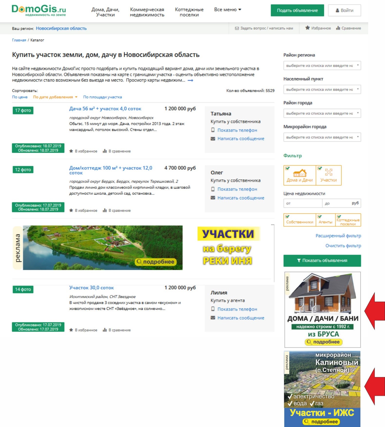 Рекламные баннеры могут быть размещены на разных страницах сайта ДомГис: в каталогах объектов, поселков; на страницах объектов, поселков; на страницах избранное и сравнение; на странице карта.